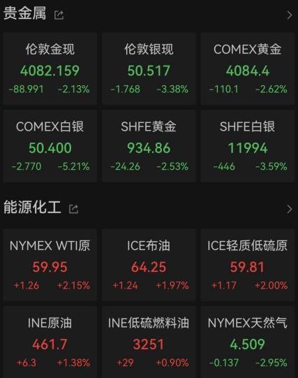 大宗商品方面,国际金价大跌。据Wind数据,当地时间11月14日,国际贵金属期货普遍收跌,COMEX黄金期货跌2.62%报4084.4美元/盎司,本周累计上涨1.86%;COMEX白银期货跌5.21%报50.4美元/盎司,本周累计上涨4.69%。