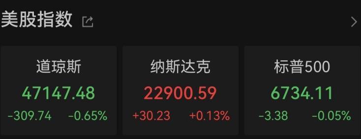 当地时间11月14日,美国三大股指早盘一度均跌逾1%,随后逢低买盘涌入,指数一路震荡走高,最后收盘涨跌不一。Wind数据显示,截至收盘,道指跌0.65%报47147.48点,标普500指数跌0.05%报6734.11点,纳指涨0.13%报22900.59点。本周,道指涨0.34%,标普500指数涨0.08%,纳指跌0.45%。