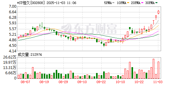 *ST恒久(维权)盘中涨停,已连收4个涨停板,截至9:39,该股报6.74元,换手率5.80%,成交量956.62万股,成交金额6365.99万元,涨停板封单金额为1047.94万元。连续涨停期间,该股累计上涨21.66%,累计换手率为32.72%。最新A股总市值达18.12亿元,A股流通市值11.12亿元。