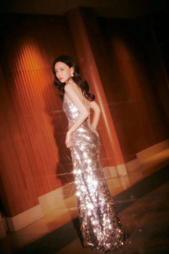 同样穿Bling Bling礼服裙的还有于文文,深V银色礼服裙仿若掉入人间的银河,整个人徜徉在闪闪发光的光芒之中,搭配复古卷发,宛如画中走下来的美人。
