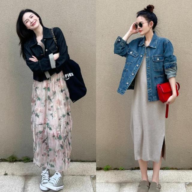 喜欢浪漫风的宝宝们,可以选择一件藏青色的牛仔衣搭配粉色系的碎花连衣裙,飘逸与帅气的混搭,浪漫唯美又充满了青春的活力感,不要太好看!