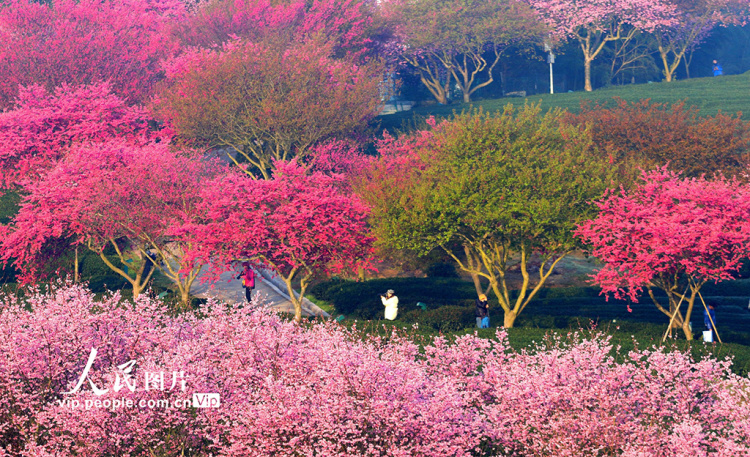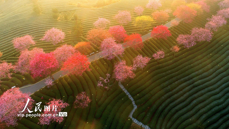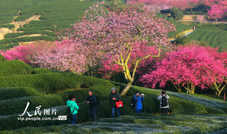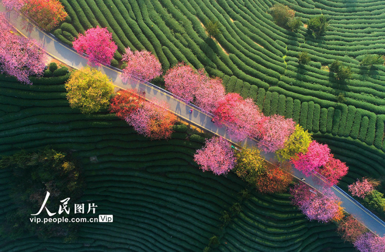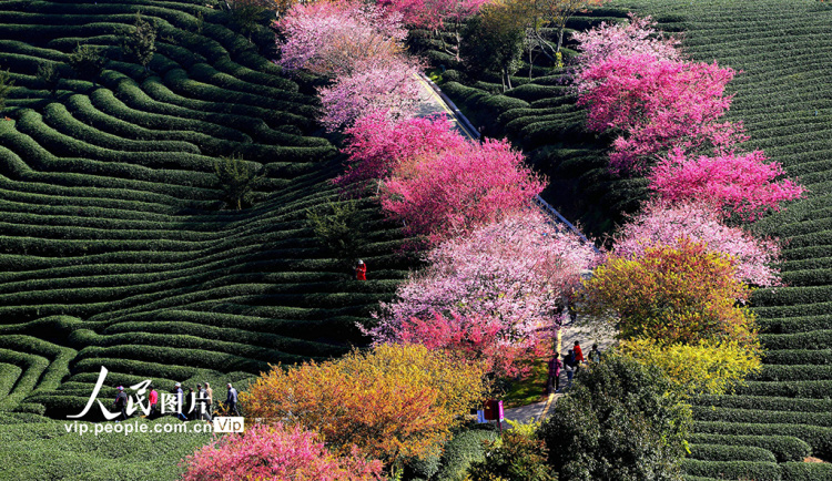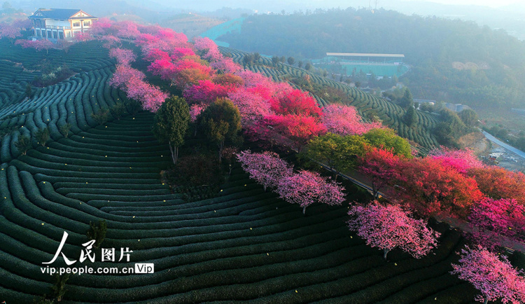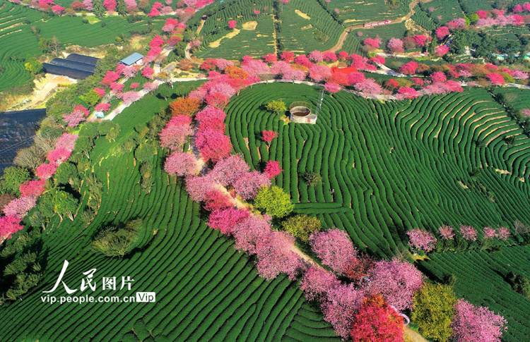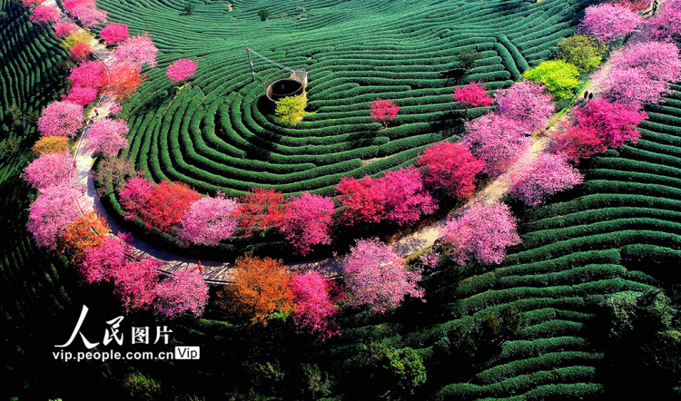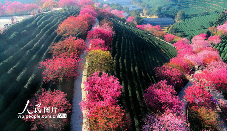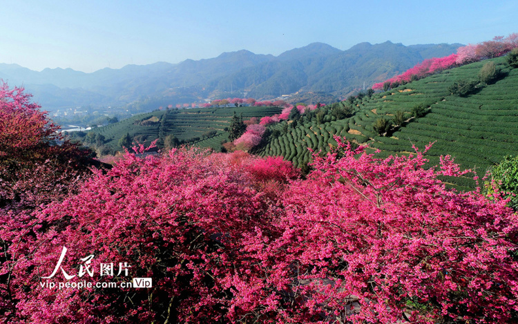 立春过后,闽西漳平市永福镇台品樱花茶园景区里数十万株、四十多个品种的樱花渐次绽放,红色的樱花与绿色的茶园相互映衬,构成一幅春意盎然、赏心悦目的多彩画卷。王闽摄(人民图片网)