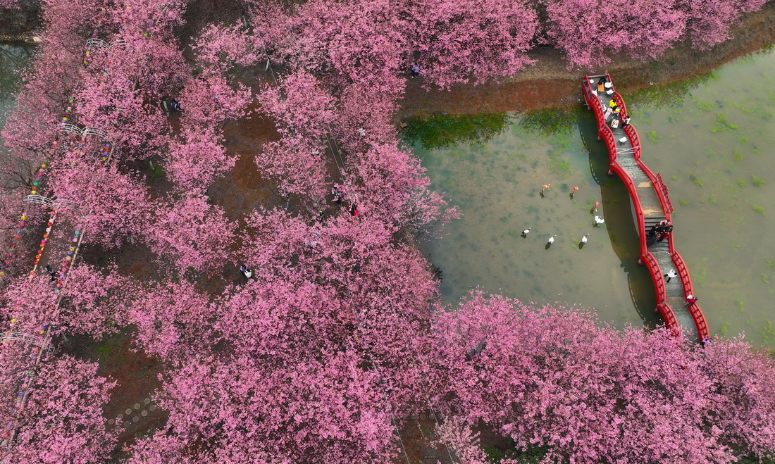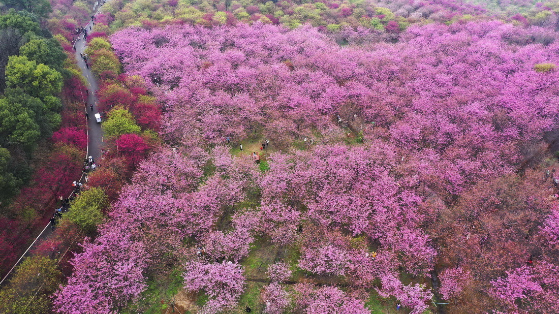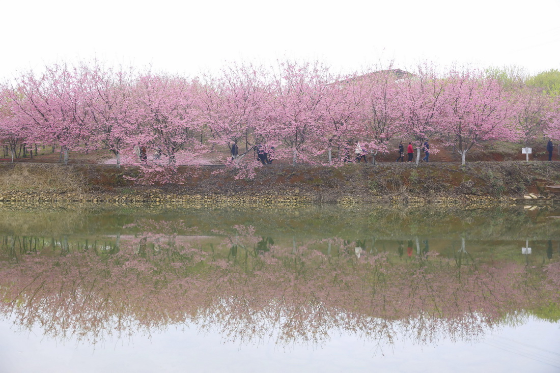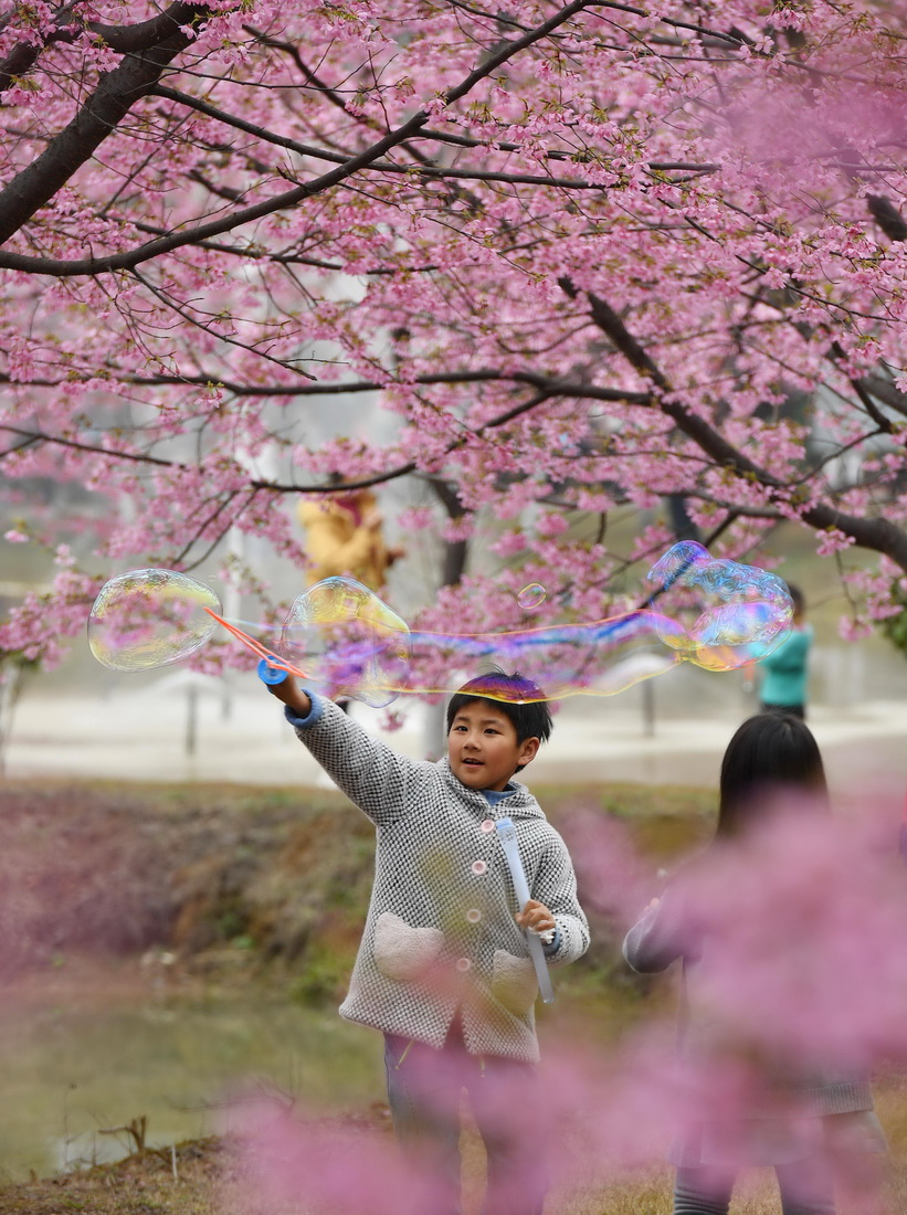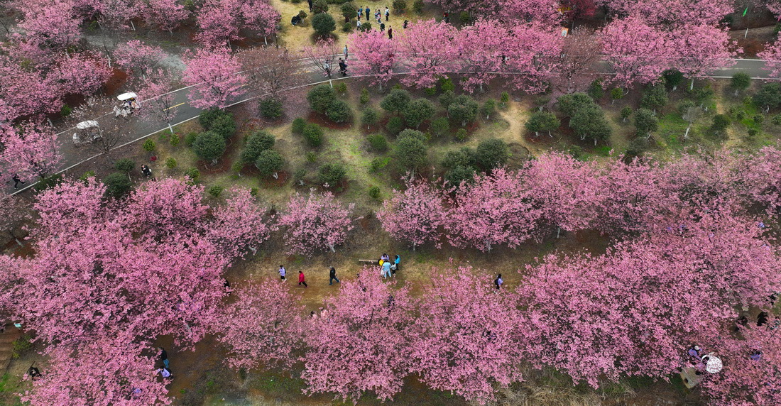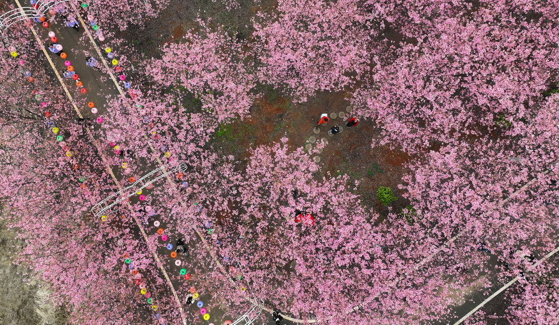 随着气温回暖,湖南省常宁市罗桥镇樱花园里的3000多亩樱花次第绽放,春色满园,吸引游客前来观赏游玩。新华社记者 赵众志 摄