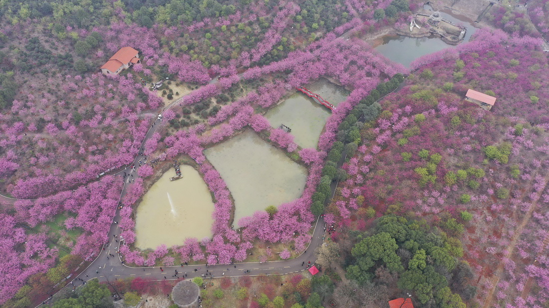 3月4日拍摄的常宁市罗桥镇樱花园一角(无人机照片)。
